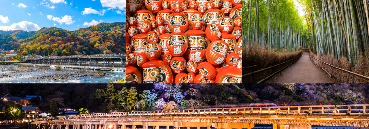 ●嵐山渡月橋:染上一層鮮豔紅色的渡月橋融入嵐山景緻,風景秀麗,成為代表京都的明媚景色。