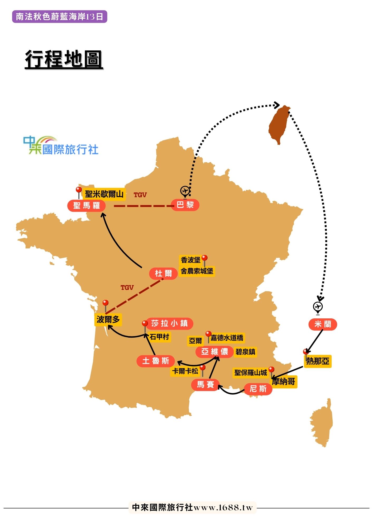 | 第3天 | 尼斯(馬塞納噴泉廣場、英國散步大道) →摩納哥(蒙地卡羅賭場.摩納哥王宮)→聖保羅山城→坎城(途經十字大道、節慶宮)→馬賽 |