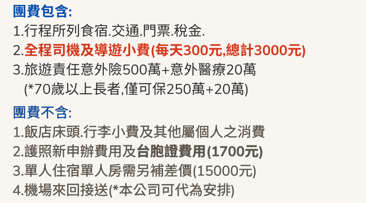 - →依規定本公司不派領隊人員服務,但於當地會安排導遊服務(*依行程內容約定).